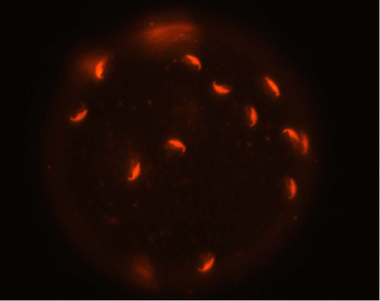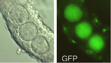 X染色体上にGFP遺伝子を持つマウスを用いて、雌雄キメラマウスを作ると精巣内で緑に光る雌の細胞を見つけることができる。