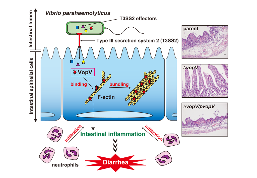 Vibrio parahaemolyticus, a Gram-negative halophilic bacterium that causes acute gastroenteritis in humans, is characterized by two type III secretion systems (T3SS), namely T3SS1 and T3SS2. T3SS2 is indispensable for enterotoxicity but the effector(s) involved are unknown. Here, we identify VopV as a critical effector that is required to mediate V. parahaemolyticus T3SS2-dependent enterotoxicity. VopV was found to possess multiple F-actin binding domains and the enterotoxicity caused by VopV correlated with its F-actin-binding activity. Furthermore, a T3SS2-related secretion system and a vopV homologous gene were also involved in the enterotoxicity of a non-O1/non-O139 V. cholerae strain. These results indicate that the F-actin-targeting effector VopV is involved in enterotoxic activity of T3SS2-possessing bacterial pathogens.