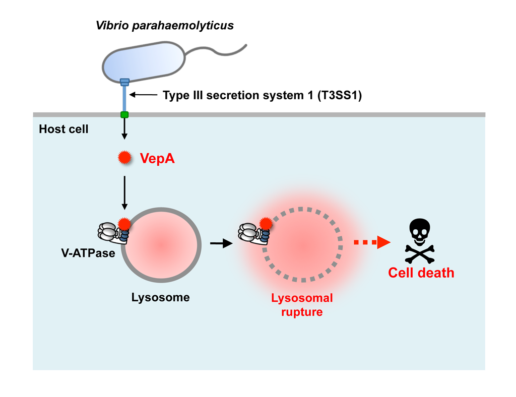 Vibrio parahaemolyticus, a causative bacterium of food-borne illness, induces host cell death during infection. VepA, an effector secreted via the type III secretion system 1, is essential for the cell death, but the mechanism of action of VepA was unclear. In this study, we demonstrated that VepA targets one of the subunits of vacuolar H+-ATPase (V-ATPase) using a yeast genome-wide screening system. We also found that VepA ruptures the lysosomes of host cells, where V-ATPases are highly expressed. Our findings suggest that a bacterial virulence factor targets lysosomes and induces subsequent cell death.