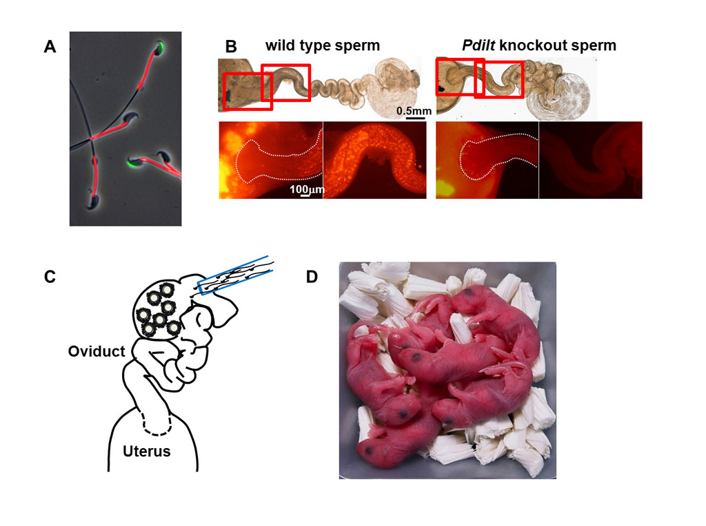 In the present study, we showed that the testis specific protein disulfide isomerase homologue (PDILT) plays an indispensable role in the quality control of sperm membrane protein, ADAM3, in the endoplasmic reticulum. Pdilt -/- mice were male infertile because their spermatozoa lacking ADAM3 could not migrate through utero-tubal junction (A and B). However, the mutant spermatozoa were able to fertilize eggs when they were directly deposited into the oviduct (C and D). We would also like to call researchers' attention to the idea that the numerous sperm binding to the zona pellucida (ZP) surface of cumulus-free eggs could have been a “red herring” and less important than previously supposed. As we demonstrated in the present paper, at least in the mouse, the spermatozoa with defective ZP binding ability are able to fertilize cumulus-covered, ZP-intact eggs effectively. We believe this paper would provide basic information on the molecular mechanism of mammalian fertilization that may affect researchers’ and clinicians’ underlying philosophies.