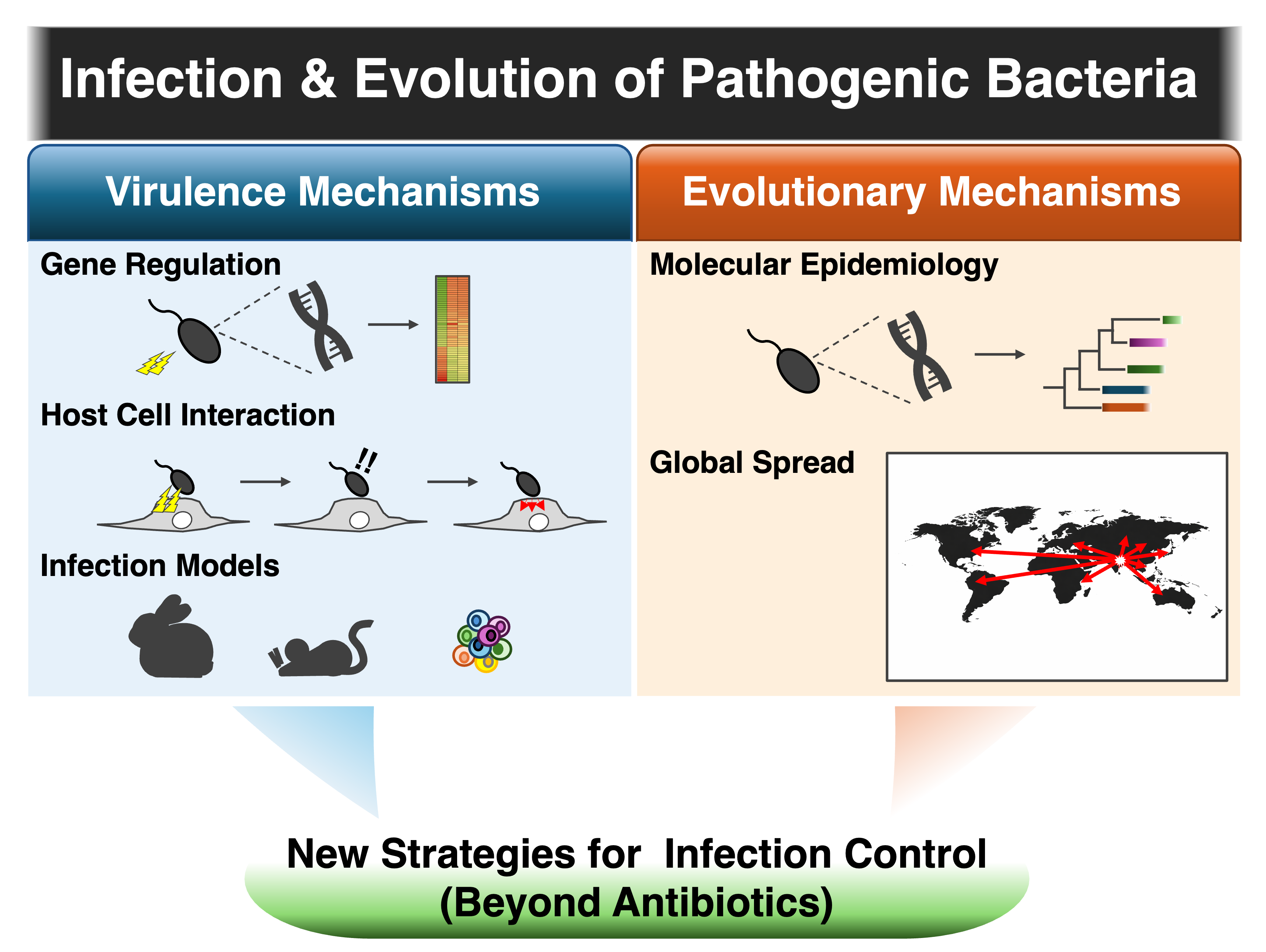 Our laboratory seeks to uncover the molecular mechanisms underlying virulence in enteric pathogenic bacteria and the evolutionary processes that drive the global emergence of these epidemic strains. By understanding these mechanisms, we aim to identify novel concepts and strategies for controlling bacterial infections beyond conventional antibiotic-based approaches.