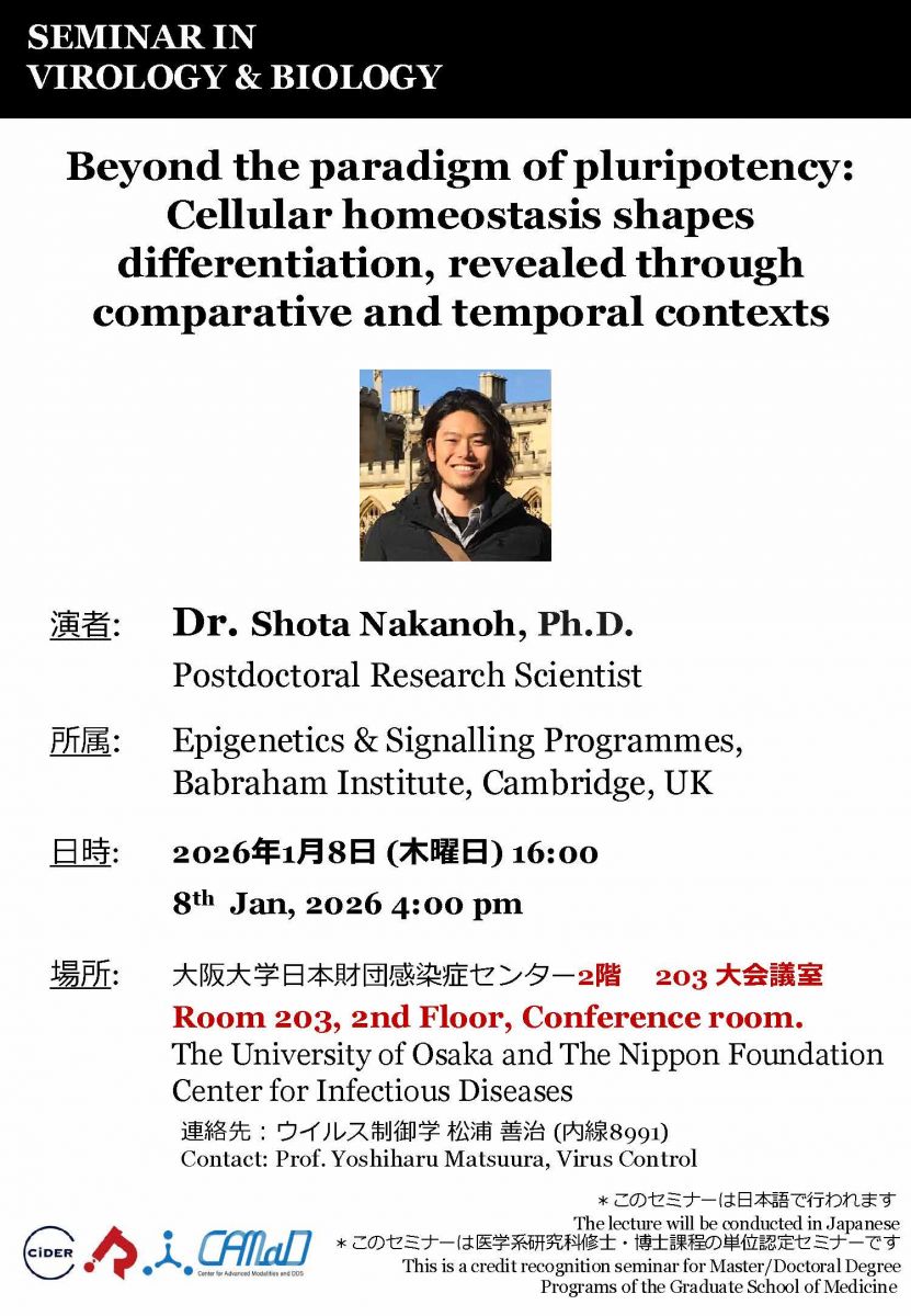 【Title】: Beyond the paradigm of pluripotency: Cellular homeostasis shapes differentiation, revealed through comparative and temporal contexts 【Speaker】: Dr. Shota Nakanoh, Ph.D. (Epigenetics & Signalling Programmes, Babraham Institute, Cambridge, UK) |
