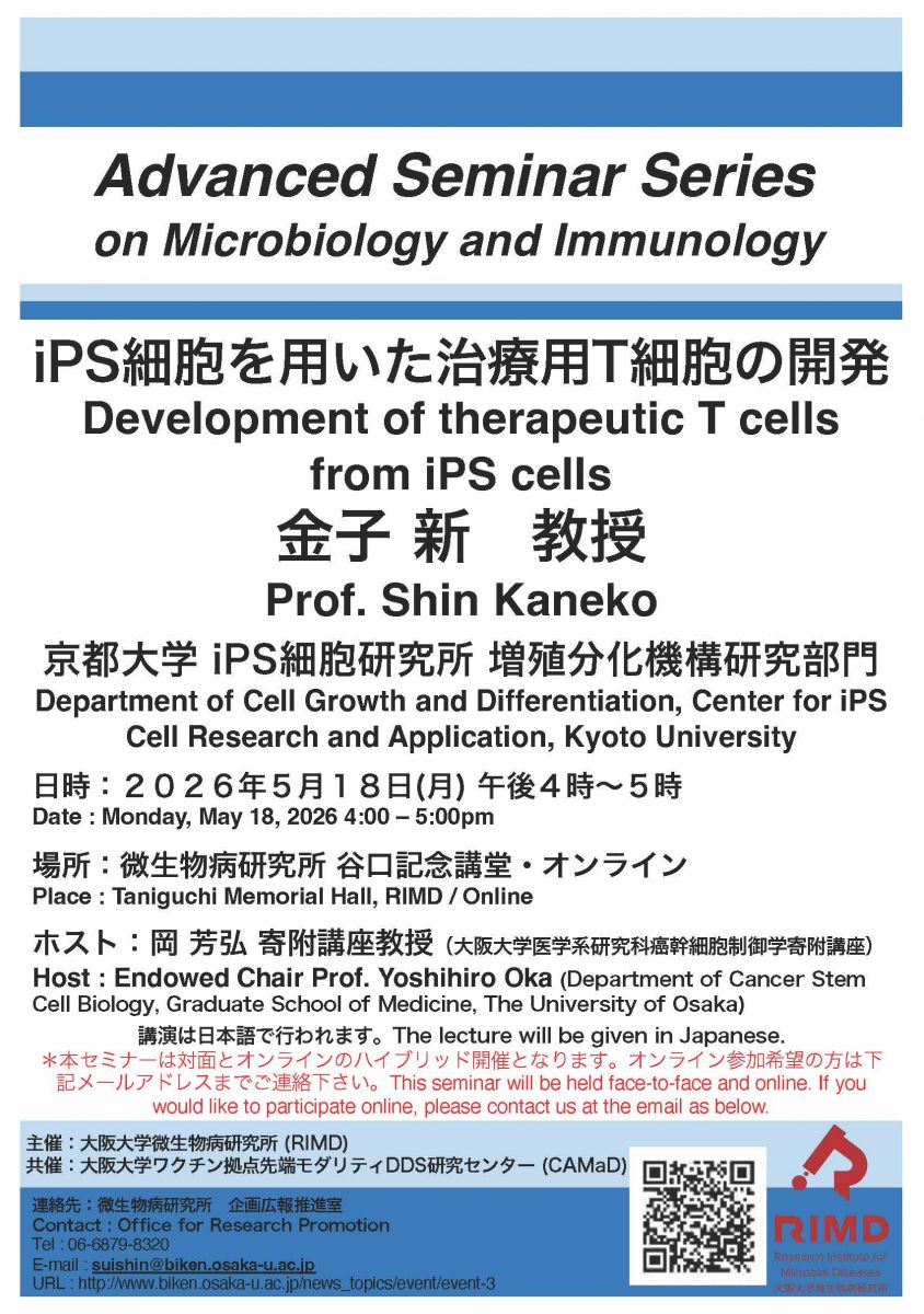 -This is a credit recognition seminar for the Master's and Doctoral Degree Programs of the Graduate School of Medicine and Graduate Program for Advanced Interdisciplinary Studies "Combined Program on Microbiology and Immunology" as well.