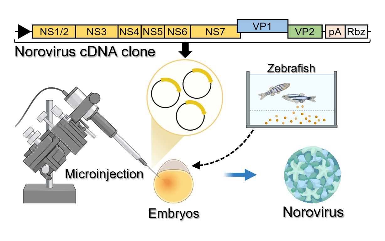 Fig. 2. Generation of recombinant noroviruses from cloned cDNA. A norovirus infectious cDNA clone was microinjected into zebrafish embryos.