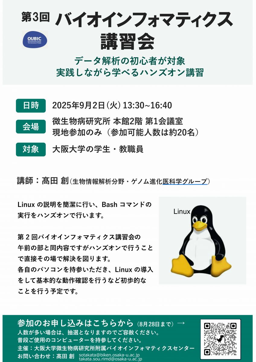 (基本編)Linuxの基礎 第2回バイオインフォマティクス講習会(2025/07/31開催)の午前の部で実施した講習内容をハンズオン形式で行います。 各自のパソコンを持参いただき、Linuxの導入をして基本的な動作確認を行うなど初歩的なことを行う予定です。Linuxの説明を簡潔に講義し、Bashコマンドの実行をハンズオン形式で行います。 |