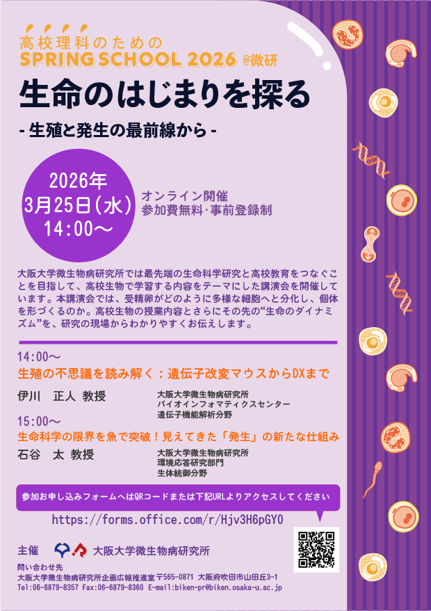 | タイトル | 高校理科のためのSpringSchool 2026@微研 「生命のはじまりを探る- 生殖と発生の最前線から -」 |