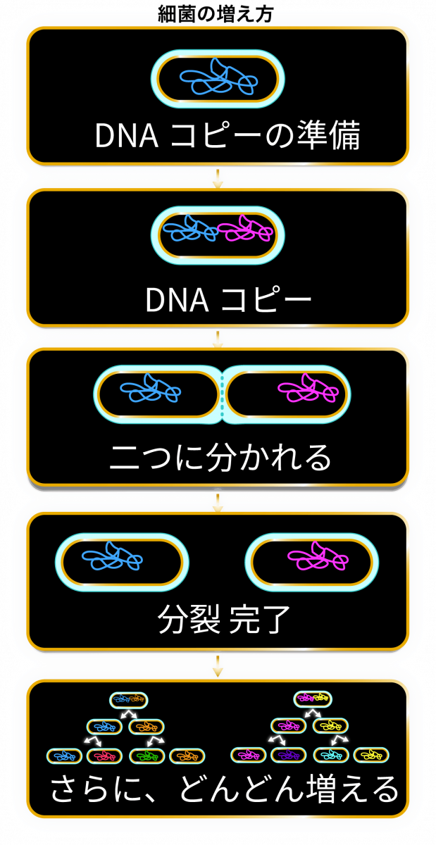 細菌は、生きている小さな生き物です。自分のDNAをコピーして、パカッと2つに分かれて増えます。