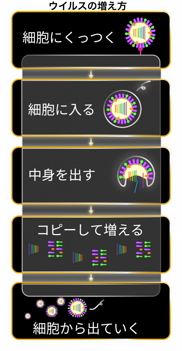 一方、ウイルスはひとりでは増えられません。細胞の中に入りこんで、細胞の力を借りて自分のコピーをたくさん作らせます。
