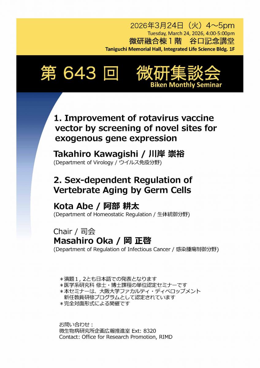 | 演 題 2 | Sex-dependent Regulation of Vertebrate Aging by Germ Cells 阿部 耕太 (生体統御分野) |